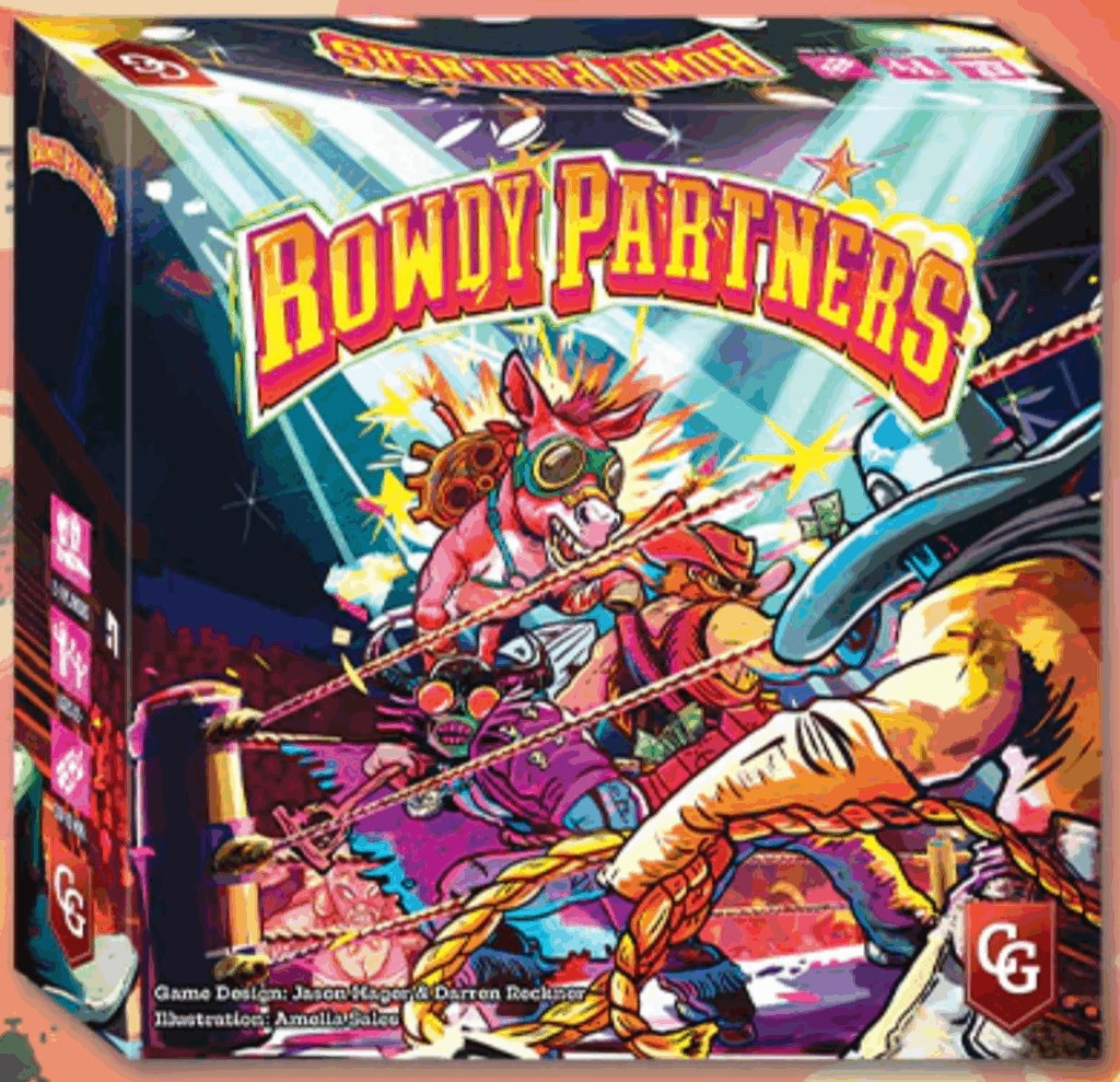Rowdy Partners is a team trick-taking game played over a series of rounds, with each round being composed of eight tricks. For games with fewer than four players, “Headliner” rules apply, where a single player acts as a one-person team with a Manager, playing two cards per trick. Work with your partner to beat the other players by draining their health through calculated strikes and sneaky counters. Swap wrestlers mid-match, unleash signature moves, and collect Pop to gain the upper hand. The team that first pins one of their opponents wins!